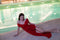 This red mini dress features a body-fitting silhouette with a snatched waist and an offshoulder neckline. An attached veil detail starts at the waist and flows down to ankle length, adding movement and contrast.